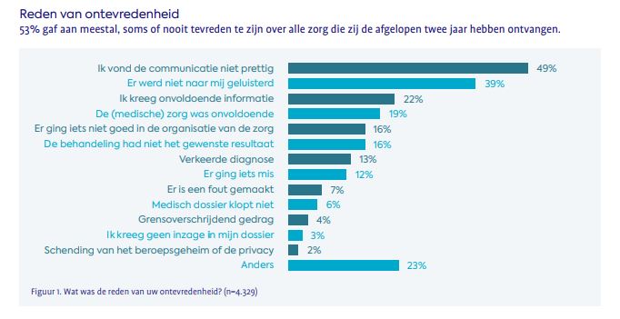 De helft van de mensen (53 procent) is niet tevreden over de zorg van de zorgverlener of zorginstelling. De meeste klachten gaan over onprettige communicatie, het slecht luisteren van de zorgverleners en het krijgen van onvoldoende informatie (zie tabel 1). Zestig procent van deze ondervraagden heeft hun ongenoegen kenbaar gemaakt. De rest deed hier niets mee. Een kwart van deze mensen liet weten niets te doen, omdat klagen volgens hen toch geen zin heeft.
