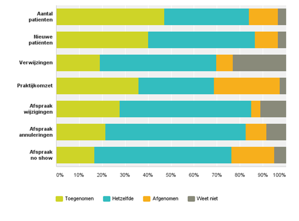 Bij mondhygiënisten is het beeld hetzelfde: de omzet staat iets meer onder druk dan de patiëntenaantallen. Aangezien 18 mondhygiënisten praktijken meededen, is dit niet representatief.
