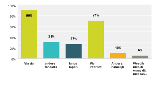 Bijna alle praktijken krijgen nieuwe patiënten door mond-tot-mondreclame, op korte afstand gevolgd door via internet. Een goede bedrijfswebsite is voor praktijken die op zoek zijn naar groei dus absoluut noodzakelijk. Instrumenten als Googleplus, Zorgkaart Nederland en Independer worden steeds belangrijker. Voor mondhygiënisten (niet meegenomen in dit diagram) is verwijzing door een tandarts ook een belangrijke bron van patiënten.