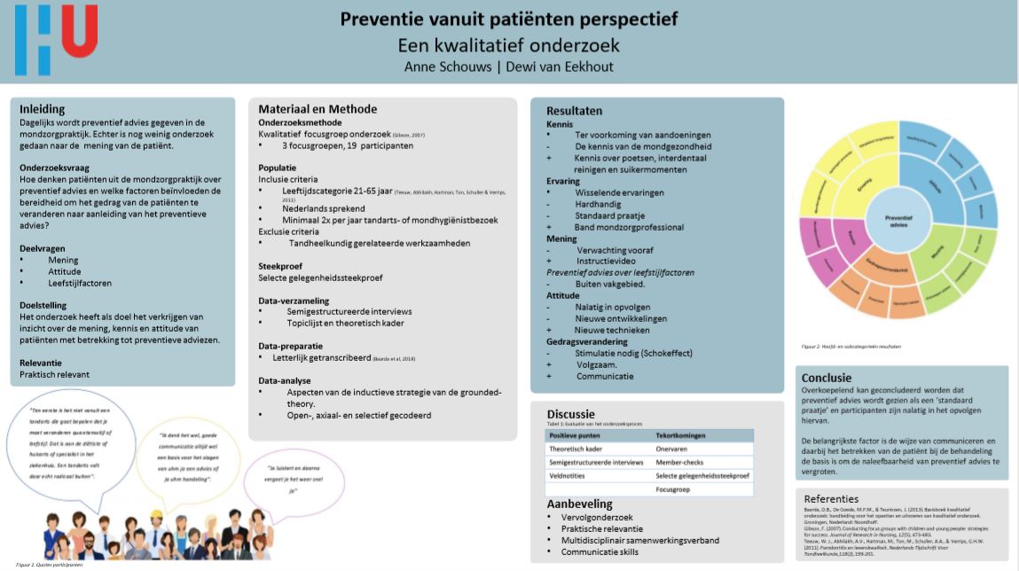 Links: poster van Anne Schouws en Dewi van Eekhout, Preventie vanuit patiënten perspectief, Een kwalitatief onderzoek, Hogeschool Utrecht, 2020 en Dental Info, Hoe kun je het beste advies over preventie aan de patiënt geven?