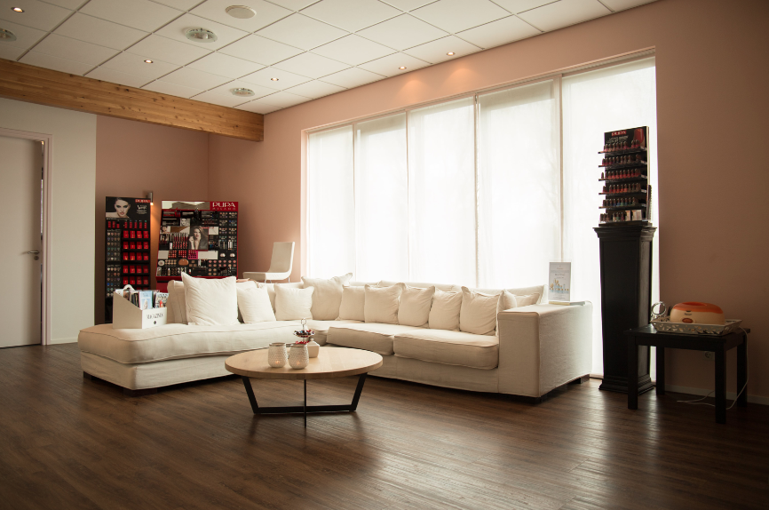 Hoewel in het pand twee totaal verschillende disciplines zijn ondergebracht, moet de tandartspraktijk een medische uistraling behouden, stelt Muller. ‘We hebben daarom gekozen voor blauw-grijs tinten in de praktijk, die als je de trap oploopt naar het beauty gedeelte warmer en rozer worden.’ Daarom heeft de tandartspraktijk op de begaande grond een bijpassende tegelvloer, terwijl de vloer van het schoonheidsinstituut op de eerste verdieping bedekt is met houtkleurige vloerbedekking.