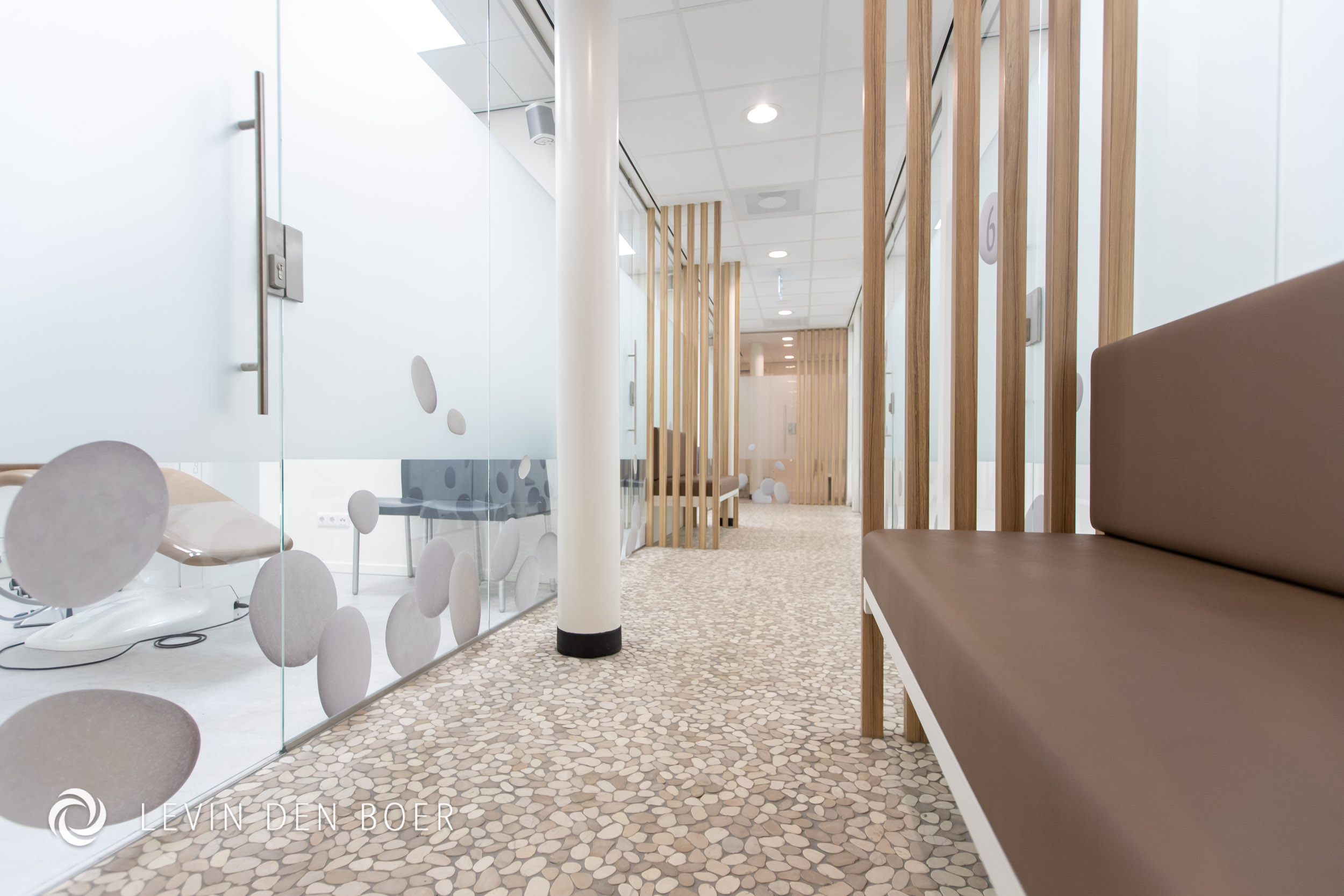 Die huiselijke, mediterrane sfeer komt overal terug. Zo heeft de praktijk kiezelstenen op de vloer die vanuit de wachtruimte via een looplijn de verbinding leggen met de behandelkamers. De behandelkamers zijn voorzien van glazen panelen, waarop dezelfde kiezelstenen zijn afgebeeld en waarin bruine vintage leren stoelen staan. Naast deze stoelen zorgen ook de zitbanken en de armaturen in de nissen van de wand voor sfeer. De poetshoek is voorzien van mozaïektegels. Verder is veel gebruik gemaakt van een koperkleur. Weysenfeld: ‘De mediterrane sfeer zie je eigenlijk overal in de praktijk terug. Van de lampen die boven de balie hangen tot de bekleding van de behandelstoelen en de zitbanken in de wachtruimte.’