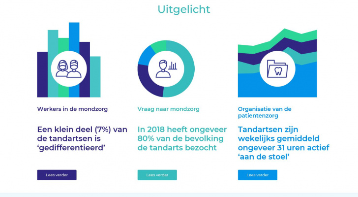 De site opent standaard, met een invoerveld voor zoektermen. Daaronder bevat de voorpagina een aantal opvallende wetenswaardigheden rond thema's als 'Organisatie', 'Toegankelijkheid' en 'Werkers in de mondzorg'. Bijvoorbeeld: 'Een deel (23%) van de tandartsen moet overrwerken of kan niet aan de zorgvraag voldoen.''Veruit de meeste (87%) tandartsen nemen nog patiënten aan'. De overzichtspagina's leiden naar bondige achtergrondartikelen, voorzien van infographics en factsheets.