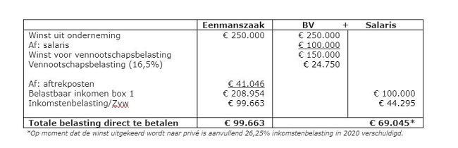 Drie jaar geleden is Jan zijn tandartsenpraktijk begonnen in de vorm van een eenmanszaak. Voor de eerste jaren een (fiscaal) goede keuze. Zo kon geprofiteerd worden van startersaftrek, zelfstandigenaftrek en MKB-winstvrijstelling. De praktijk groeide snel en ook de resultaten groeiden snel mee. In 2019 realiseerde de praktijk een winst van € 300.000, de verwachting is dat in 2020 een winst van € 250.000 wordt gerealiseerd. Jan vraagt zich af of de overstap naar de BV wellicht fiscaal interessant is.