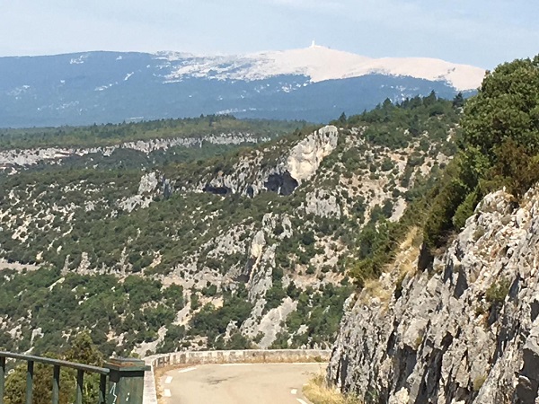 Nauwelijks geslapen probeer ik zelf nog even te relaxen, nu ze zijn vertrokken. Dan samen met Thea en Henk de lopers achterna. Eerst naar Sault, dan de weg naar de Mont Ventoux op. Na 7 kilometer passeren we Loes. Ze loopt alleen. Nu is het ieder voor zich en God voor ons allen. Zit er een religieuze dimensie aan dit lopen? De berg Sinaï, de berg Ararat, de Olympus, en vele andere bergen spelen een rol in ons collectieve geheugen. Zingeving aan iets dat schijnbaar zinloos is, leven met kanker, leven en dood.