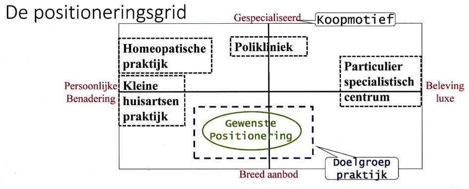 Hierboven gaan we ervan uit dat u een breed aanbod aan medische diensten aanbiedt in een groepspraktijk. De alternatieven zijn naast uw eigen positionering in deze grid gezet. Uw doelgroep is dus de groep mensen die uw aanbod aantrekkelijk vindt. Anderen maken andere keuzes.