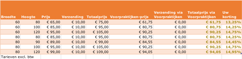 Onze leverancier heeft ruim voldoende voorraad en productiecapaciteit om binnen 7 dagen de standaardmaten te leveren tegen de volgende condities, die door Voorpraktijken zijn bedongen voor u: