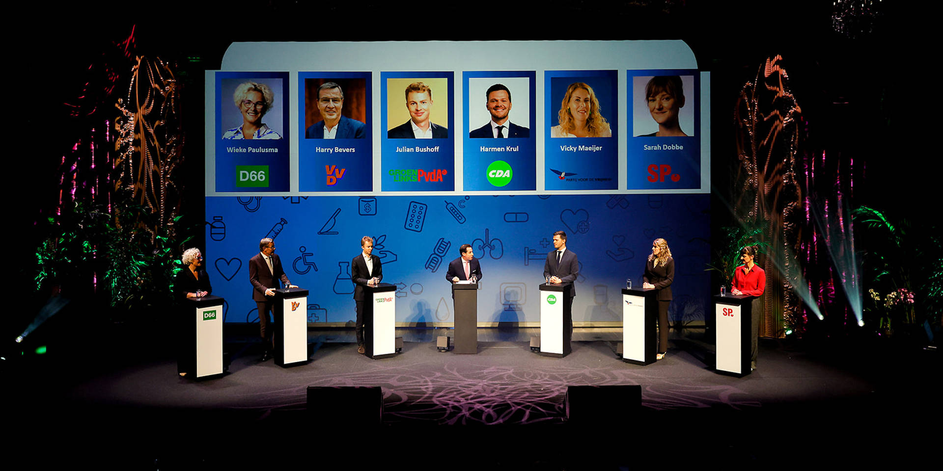 Bij de vijfde editie van het Grote Zorgdebat in het Beatrixgebouw in Utrecht, op dinsdagavond, is het snel duidelijk: alle partijen willen meer preventie, maar niet iedereen bedoelt hetzelfde. De zes deelnemende partijen – VVD, D66, GroenLinks-PvdA, CDA, SP en PVV – kruizen de degens over drie thema’s: werken in de zorg, de wachtlijsten en preventie. De toon is soms fel, de verschillen in accenten lijken groot. Op veel punten bestaat ook overeenstemming, signaleert Skipr.