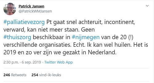 ‘Hier is het vrij hopeloos ja. De sociale wijkteams en het Wmo-loket die dit soort dingen moeten regelen zijn wegbezuinigd of onderbezet en kunnen niet leveren wat ze moeten leveren. Het sociaal wijkteam heeft een rol in de coördinatie, maar wij hebben geen aanspreekpunt en ze zijn niet bereikbaar. Als je het Wmo-loket wil bereiken kun je over een half jaar een keukentafelgesprek krijgen. Al die frustratie bij elkaar maakt dat ik die tweet verzonden heb.’