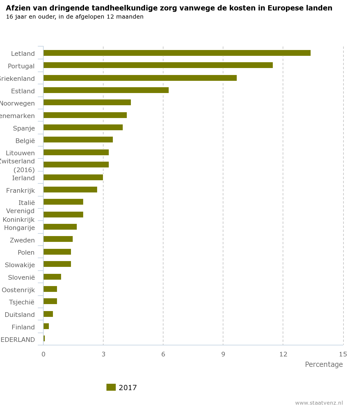 In de onderstaande grafiek staan percentages, van mensen die dringende mondzorg mijden vanwege kosten, per Europees land. Hieruit blijkt dat Nederland met 0,1 procent het beste scoort in vergelijking met andere Europese landen. In Letland ligt het percentage mondzorg mijders zelfs op 13,4 procent. Ook Portugal en Griekenland scoren hoog met percentages van 11,5 en 9,7 procent.